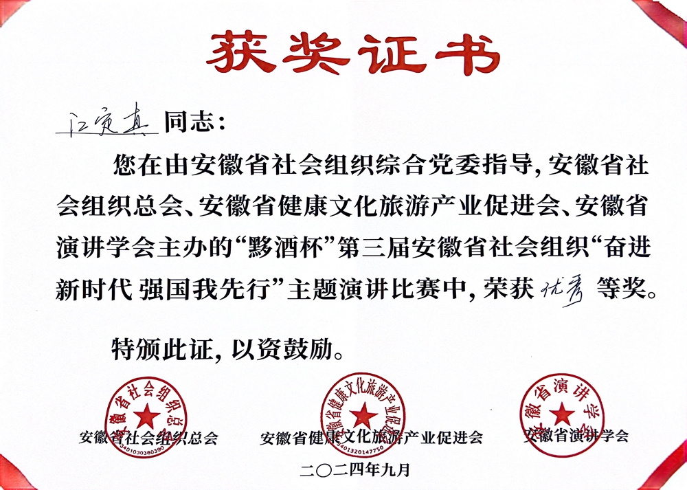 9月21日,第三屆安徽省社會組織“奮進(jìn)新時(shí)代 強(qiáng)國我先行”主題演講比賽復(fù)賽、決賽在合肥舉行,公司選送參賽選手江定真參加角逐,經(jīng)過激烈比拼,榮獲優(yōu)秀獎(jiǎng)。