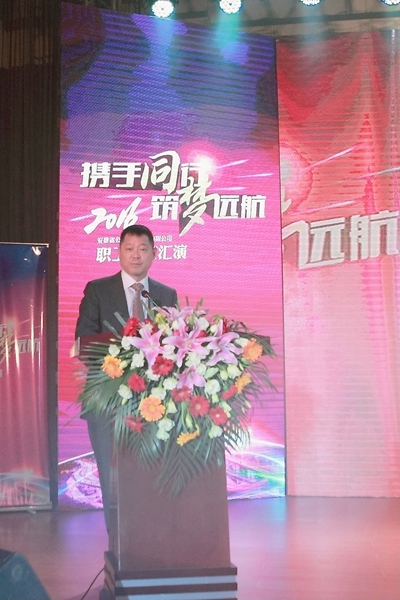 演出現(xiàn)場華燈璀璨,座無虛席,氣氛喜慶熱烈。匯演正式開始前,公司董事長、總經(jīng)理孫學(xué)軍發(fā)表了熱情洋溢的致辭。他首先代表公司向蒞臨現(xiàn)場的嘉賓及長期以來堅持在公司各個崗位的員工及家屬,致以誠摯的問候和新春的美好祝愿,向默默奉獻,為路橋事業(yè)奠基的前輩們致以崇高的敬意。指出,2015年,是宏觀形勢錯綜復(fù)雜的一年,也是公司成績斐然的一年,在建工集團的正確領(lǐng)導(dǎo)下,全體員工凝心聚力,開拓奮進,取得了驕人的業(yè)績。充滿機遇和挑戰(zhàn)的“十三五”已經(jīng)開局,全體路橋人要秉承優(yōu)良傳統(tǒng),凝心聚力,同舟共濟,譜寫安徽路橋新的輝煌。