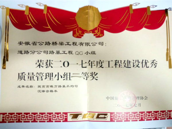 近日,在中國施工企業(yè)協(xié)會2017年度全國工程建設質(zhì)量QC小組成果發(fā)布暨評審會上,由道路分公司QC小組選送的《提高高填方路基不均勻沉降合格率》成果,從全國千余個QC成果中脫穎而出,以優(yōu)異的成績榮獲2017年度工程建設優(yōu)秀質(zhì)量管理小組成果二等獎,為公司贏得了榮譽。