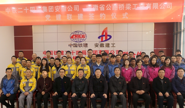 12月12日下午,合肥軌道交通4號(hào)線01標(biāo)聯(lián)合體中鐵二十四局安徽公司項(xiàng)目部黨支部和安徽省路橋公司項(xiàng)目黨支部黨建聯(lián)建簽約儀式隆重舉行。安徽路橋公司黨委書記、董事長(zhǎng)、總經(jīng)理孫學(xué)軍,紀(jì)委書記林緒坤,副總經(jīng)理任杰,中鐵二十四局集團(tuán)安徽公司黨委書記房明州,黨委副書記、紀(jì)委書記侯衛(wèi)超等領(lǐng)導(dǎo)出席。