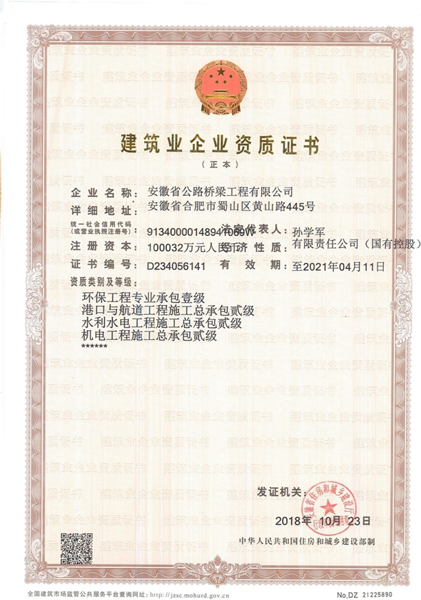 10月23日,公司環(huán)保工程專業(yè)承包壹級、水利水電工程施工總承包貳級、機電工程施工總承包貳級三項資質(zhì)順利通過安徽省住房和城鄉(xiāng)建設(shè)廳審查核準。三項新資質(zhì)的取得為公司進一步拓展非公路施工業(yè)務,實現(xiàn)經(jīng)營業(yè)務多領(lǐng)域發(fā)展打下了基礎(chǔ)。