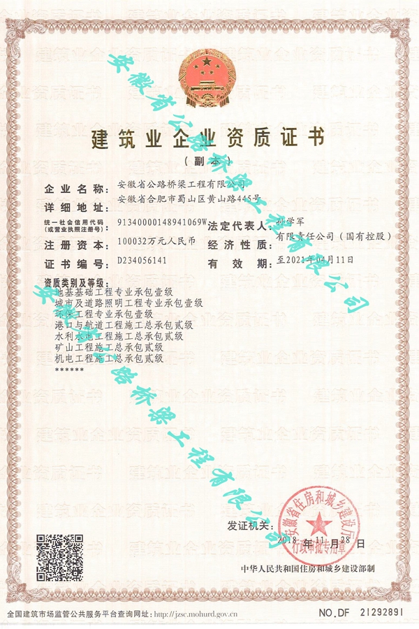 11月28日,公司地基基礎(chǔ)工程專業(yè)承包壹級(jí)、城市道路照明工程專業(yè)承包壹級(jí)、礦山工程施工總承包貳級(jí)三項(xiàng)資質(zhì)順利通過(guò)安徽省住房和城鄉(xiāng)建設(shè)廳審查核準(zhǔn)。
