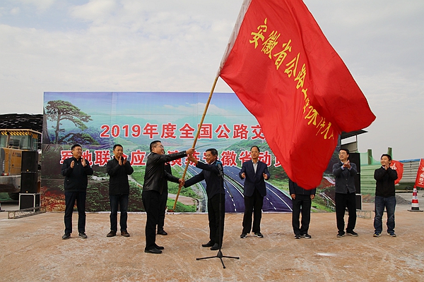 隨后舉行了授旗儀式,章后忠將一面“安徽省公路工程保障大隊”旗幟鄭重授予公司總經(jīng)理錢申春。