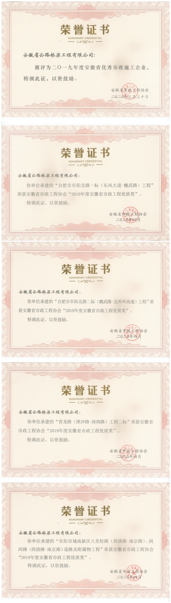 近日,安徽省市政工程協(xié)會發(fā)布2019年度安徽省優(yōu)質(zhì)工程獎評選結果和2019年度安徽省優(yōu)秀市政施工企業(yè)。阜陽北路高架北延一標、二標,阜陽八里松路項目、青龍路工程二標等項目被授予“2019年度安徽省市政工程優(yōu)質(zhì)獎”,公司再次榮獲“2019年度安徽省優(yōu)秀市政施工企業(yè)”稱號。
