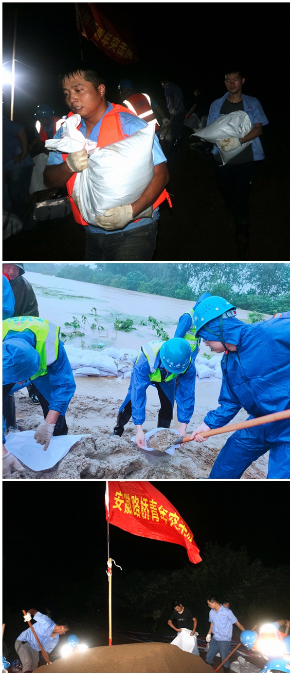 這群95后新員工剛到項目上工作沒有幾天,就面臨了一次“勞其筋骨”的大考。但面對困難,他們沒有退縮。 一些項目青年聞“汛”而動,自發(fā)組織青年志愿者、青年突擊隊奔赴前線,吹響青春集結(jié)號。在抗洪一線,他們肩扛手提,裝袋、搬運、填筑,汗水浸透了衣服,實在干不動了,席地而坐或杵著鐵鍬稍作休息,隨后繼續(xù)投入戰(zhàn)斗。在“青年突擊隊”紅旗的輝映下,他們與洪水搏擊,與險情對戰(zhàn),團結(jié)協(xié)作,筑起了一道道“青春堤壩”,阻擋了洪水肆虐的腳步,“后浪”搏擊洪災,有力地推進了搶險進度。