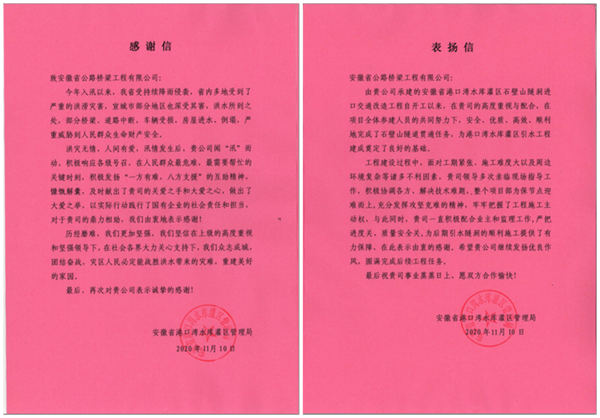 近日,由安徽路橋公司承建的宣城市寧國(guó)港口灣水庫(kù)灌區(qū)石壁山隧道進(jìn)口交通改造工程獲安徽省港口灣水庫(kù)灌區(qū)管理局來(lái)信感謝,對(duì)公司在入汛時(shí)發(fā)揮國(guó)企擔(dān)當(dāng)、積極抗洪搶險(xiǎn),安全、優(yōu)質(zhì)、高效完成石壁山隧道進(jìn)口交通改造任務(wù)表示感謝。