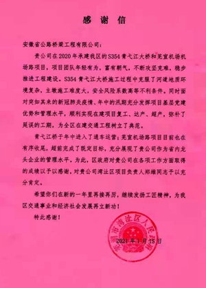 1月15日,蕪湖市灣沚區(qū)人民政府向安徽路橋公司發(fā)來感謝信,對公司順利完成青弋江橋和蕪宣機(jī)場路項目施工任務(wù)予以感謝。