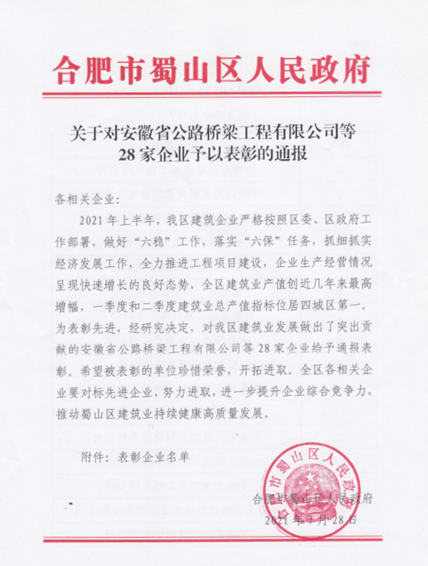 上半年,公司認真謀劃、統(tǒng)籌部署,堅持疫情防控和生產(chǎn)經(jīng)營兩手抓、兩手硬,積極做好“六穩(wěn)”工作、嚴格落實“六?!比蝿?wù),企業(yè)生產(chǎn)經(jīng)營情況始終保持增長態(tài)勢,為蜀山區(qū)建筑業(yè)總產(chǎn)值指標上半年位居全市首位做出了突出貢獻,為此,蜀山區(qū)人民政府對公司給予通報表彰。下一步,公司將珍惜榮譽,緊緊圍繞“十四五”戰(zhàn)略規(guī)劃,進一步提高競爭力,持續(xù)推進品質(zhì)路橋卓越路橋建設(shè),為推動蜀山區(qū)建筑業(yè)高質(zhì)量發(fā)展作出新的更大貢獻。